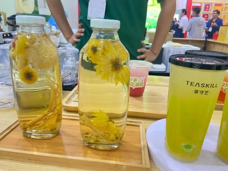 茶守藝的展位前,長隊(duì)從開展起就沒斷過。穿綠衫的工作人員手速飛快,剛萃好的茶湯注入茶杯:“這是新款‘輕顏養(yǎng)生茶’,加了菊花和人參,喝著清爽還養(yǎng)人。”