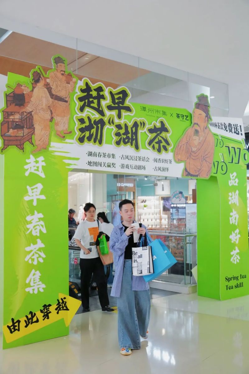 在春茶上新之際,茶守藝特別策劃了湖南首個(gè)古風(fēng)茶市主題“趕早,沏湖茶”,運(yùn)用以古作新的手段方式,聯(lián)合中心印象城潭州市集,進(jìn)一步促活中青年群體茶飲市場(chǎng),賦予古老湖南茶嶄新的生命力。